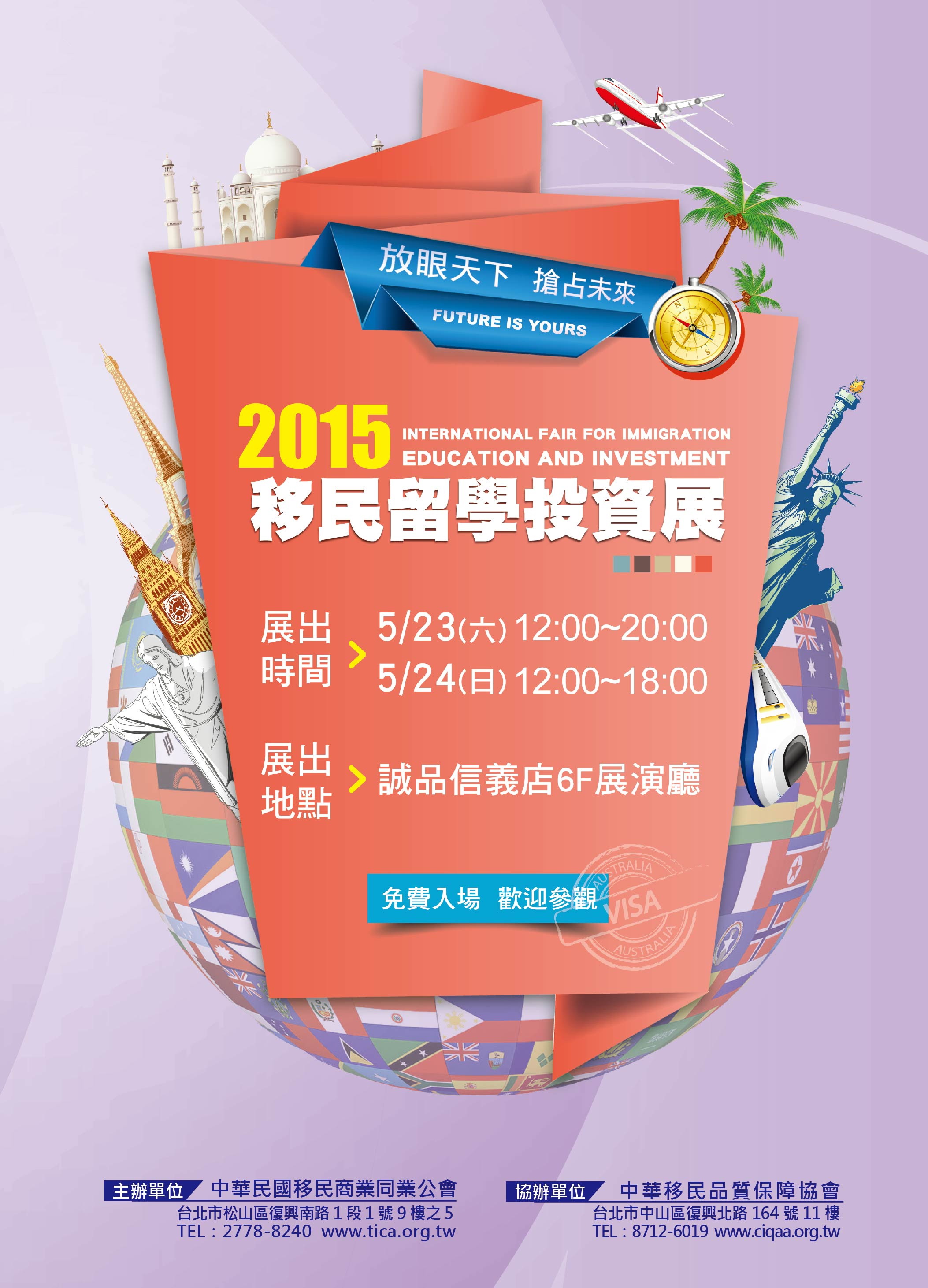 由中華國移民商業同業公會主辦,中華移民品質保障協會協辦的「2015移民留學投資展」將於5/23、24日假台北市誠品信義6F展演廳(台北市松高路11號)展出。本展覽將為民眾提供美國、加拿大、澳洲、紐西蘭、新加坡、馬來西亞、日本、英國、葡萄牙、聖克里斯多福及尼維斯、塞浦路斯等國之移民、留遊學及房地產投資最新、最專業訊息。